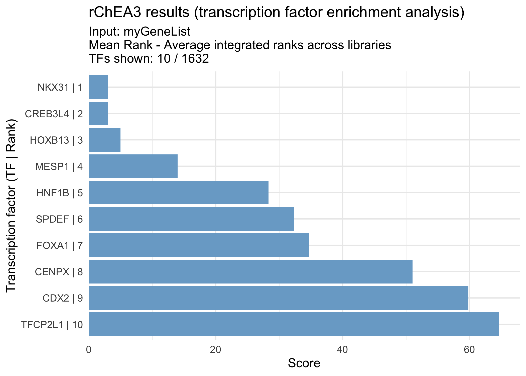 This table contains the averaged ranks of transcription factors across all ChEA3 libraries, providing a global view of TF enrichment for your gene set.