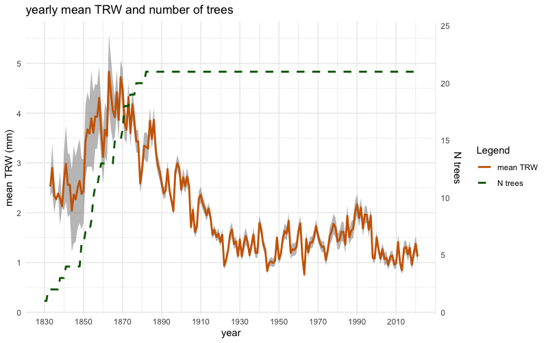The object inData can be initially used to plot the mean chronologies of raw tree-ring widths (mm) and raw basal area increments (cm²), including their standard errors, alongside the corresponding number of trees, using the two following functions: