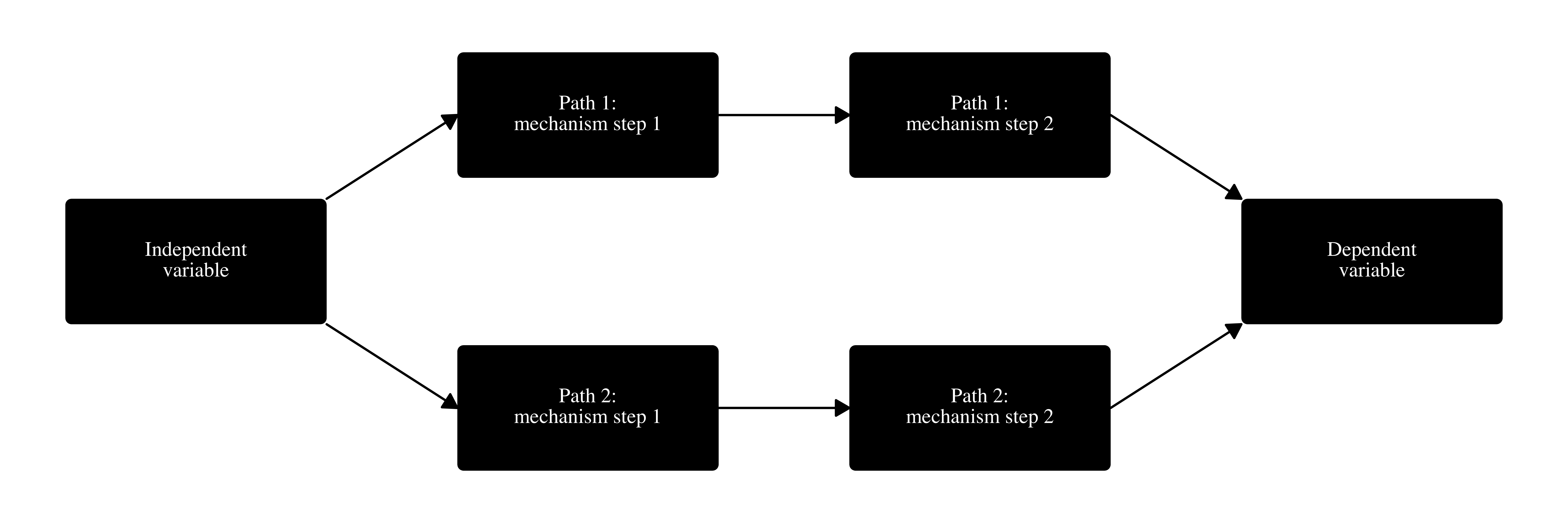 A two-step causal mechanism plot with an independent variable, dependent variable, and two separate causal pathways.